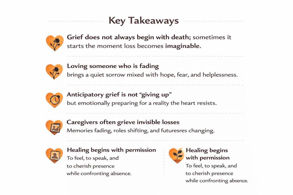 Anticipatory grief reminds us that love and loss are deeply intertwined. To grieve someone who is still present is to acknowledge the depth of connection and the fragility of time. By allowing space for both sorrow and presence, individuals can navigate this journey with tenderness, meaning, and emotional resilience.