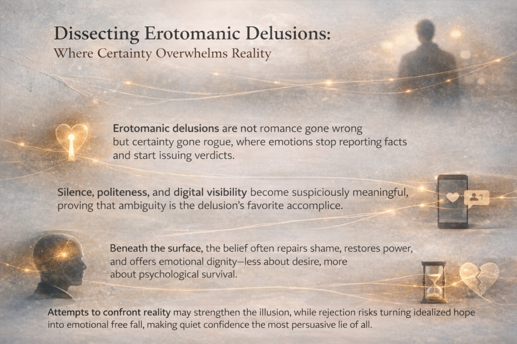 • Erotomanic delusions are not romance gone wrong but certainty gone rogue, where emotions stop reporting facts and start issuing verdicts.